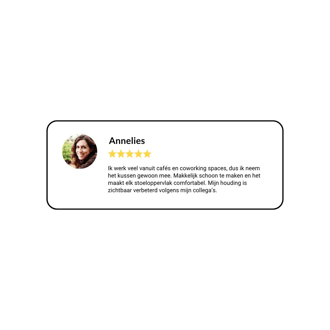 Ik werk veel vanuit cafés en coworking spaces, dus ik neem het kussen gewoon mee. Makkelijk schoon te maken en het maakt elk stoeloppervlak comfortabel. Mijn houding is zichtbaar verbeterd volgens mijn collega’s.